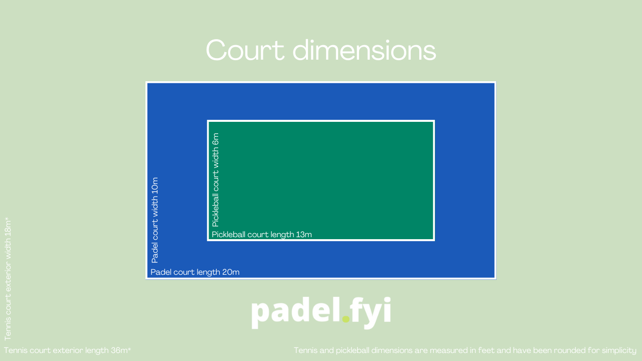 Both padel and pickleball courts are significantly smaller than tennis courts - padel courts are roughly 1/3 of the size of a tennis court, while pickleball courts are roughly 1/4 of the size of a tennis court.
